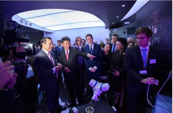伦敦时间10月21日上午,习近平主席与夫人彭丽媛在约克公爵安德鲁王子、财政大臣乔治·奥斯本的陪同下,参观了伦敦帝国理工学院哈姆林研究中心。中心负责人、上海交通大学自动化系校友杨广中教授接待了习近平一行。