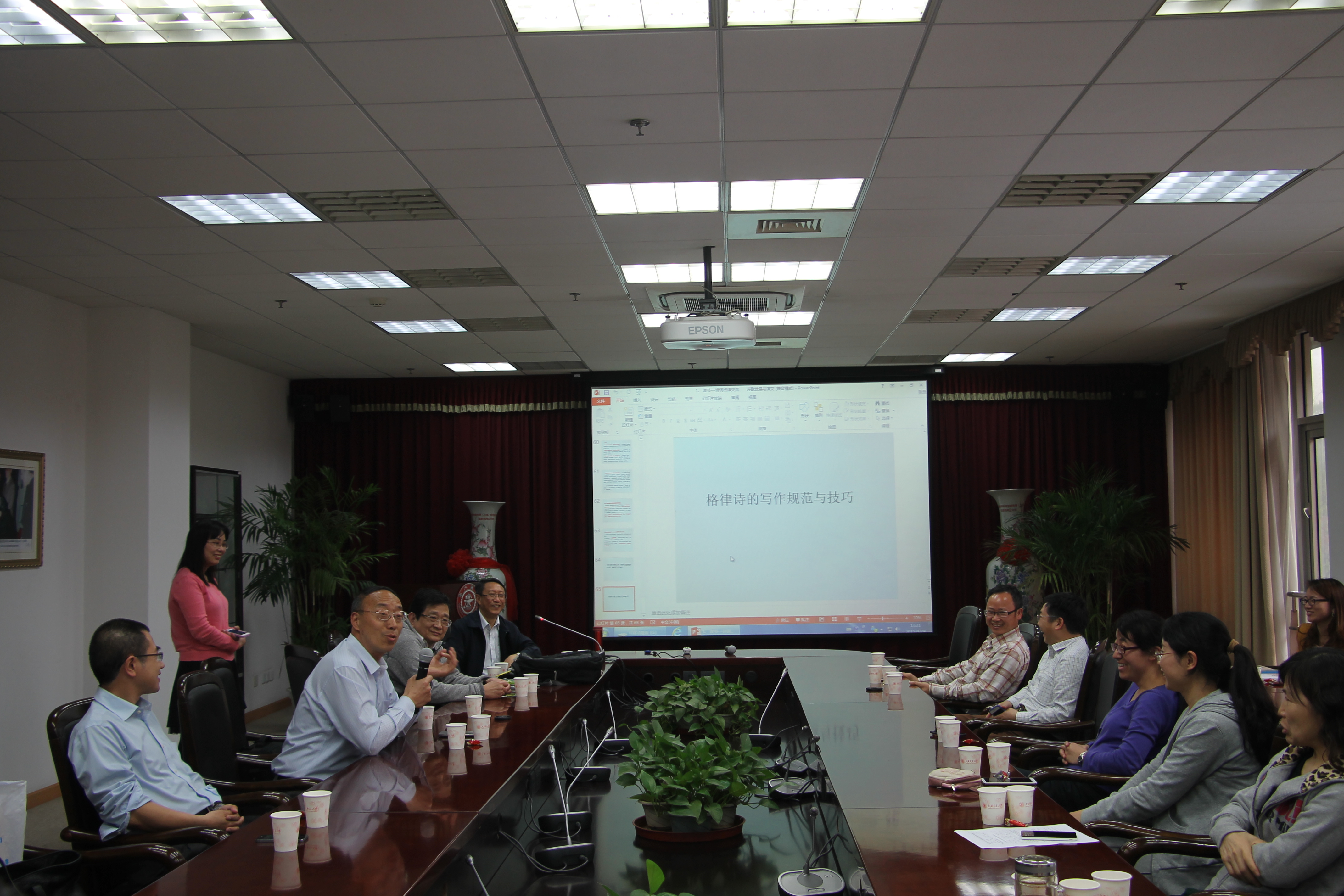 作为电子系“书影寻春”系列活动之一, 2015年4月29日中午在新盛娱乐 3号楼208会议室举行了“品茗赏诗”活动。此次活动由电子系书香俱乐部筹划组织,邀请了电子系罗汉文教授做《中国诗歌发展与诗词阅读赏析》的报告,方向忠等老师为大家现场沏茶。当日有包括电子系及其它院系的几十名教职工参加了此次活动。