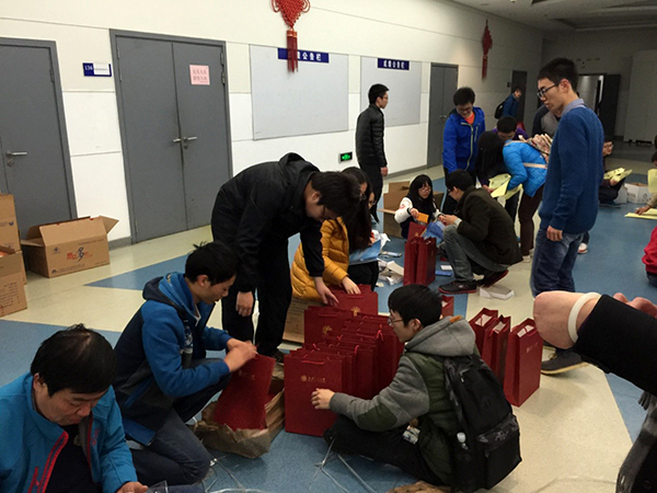 4月9日晚,纪念品装配工作开始。要将十余件物品无一遗漏地装进800个袋子绝非易事,可不到3个小时,800个袋子就装配成功。看着满走廊红色的“浪涛”,一位志愿者笑着表示,一晚上完成这么多工作,有很强的满足感。这些礼物只是小小的心意,希望老校友们能宾至如归,重新感受到母校的温暖。