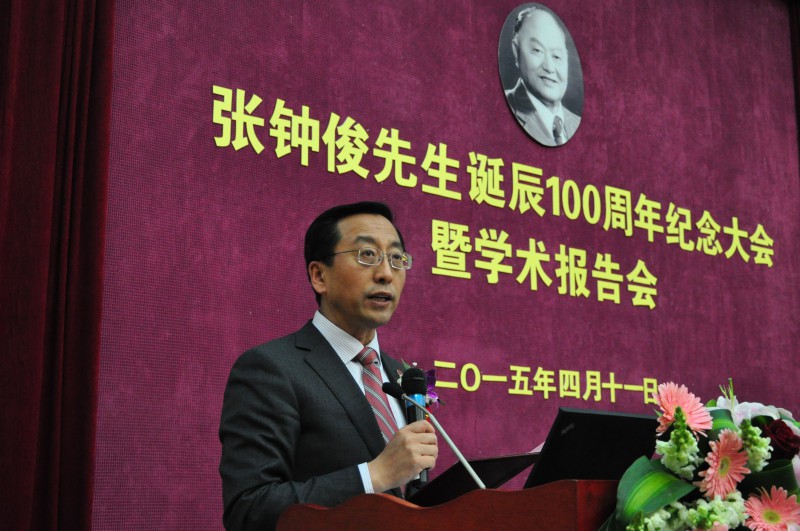 会议伊始张杰校长向大会致辞。他在回忆中说,当年他的办公室和张先生雕塑非常近,每次经过时都会因念起张先生的事迹而振奋从而更加用心地工作。他相信张先生热爱祖国,奉献社会,用于开拓,不断创新的精神会激励所有的交大学子,这种精神连同张钟俊院士的名字永远铭刻在我们的心中。