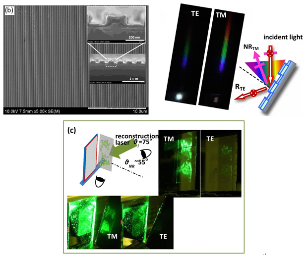 郑君和叶志成等提出的非共振、基于表面等离子体波导效应的超颖表面不仅在物理机制上取得突破,而且表现出了新颖的光学偏振特性:TM偏振光被强烈衍射,而TE偏振光衍射消失。从而实现了宽光谱、大角度的TM光负反射和TE光反射, 负反射抑制比可以达到103,反射抑制比达到106。利用该超颖表面,实现了新型偏振全息防伪,为全息防伪又多加了一把锁。与其他超颖表面结构相比,该新结构制备工艺要求低,可以实现大规模量产。