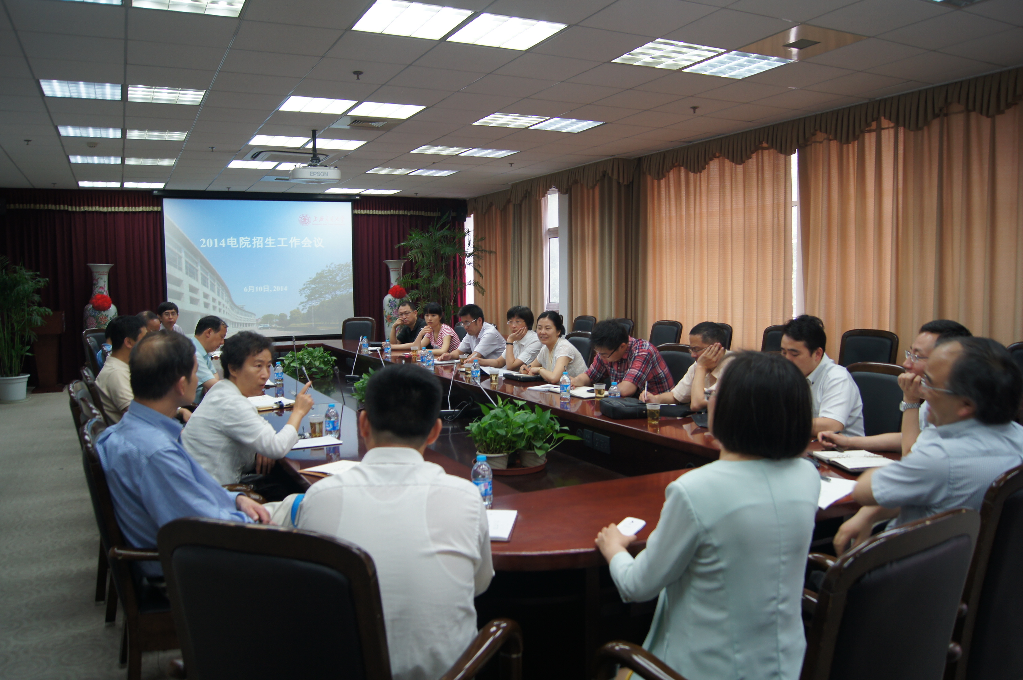 6月10日上午,2014年上海交通大学电子信息与电气工程学院本科生招生工作会议在新盛娱乐 群楼3-208会议室顺利召开。院长毛军发、院党委书记苏跃增、副院长李少远、院党委副书记、工会主席莫光成以及即将奔赴北京、重庆、四川、海南等六省市地区的一线招生教师代表出席了会议。