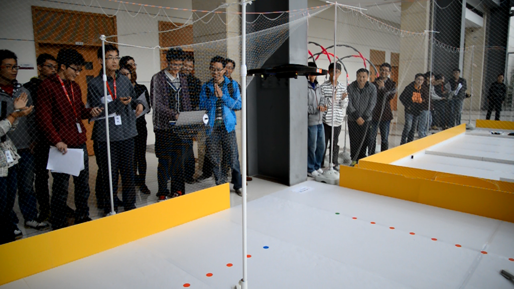在紧张的抽签后,比赛拉开了序幕。上午的比赛中,快速目标跟随飞行、寻迹自主飞行在两个赛场上同时角逐,比赛安排十分紧凑,场面十分精彩。