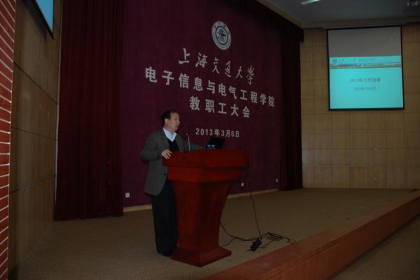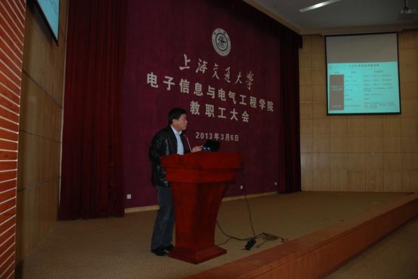 2013年3月6日,电子信息与电气工程学院全院教职工大会在微电子大楼多功能厅隆重召开,会议传达了学校党委全委扩大会议与2013年学校上半年工作会议精神,简要回顾了学院2012年工作,部署了学院2013年各项工作。