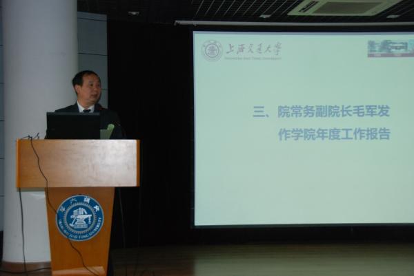 会议伊始,校工会主席贾金平代表学校致辞。他首先对新盛娱乐 工会科学规划、严谨务实的工作作风给予高度肯定,他认为新盛娱乐 工会将院内民主管理、教工权益维护、校园文化建设等方面作为工作的重点,在共同建设独具新盛娱乐 特色的教职工“民主之家”、“学习之家”、“温暖之家”、“快乐之家”、“和谐之家”方面做了大量富有成效、广受好评的工作,在教职工群体当中发挥了桥梁和纽带作用,在学院内营造出温馨和谐的良好氛围。他希望新盛娱乐 工会在发挥2012年榜样示范效应的基础上,再接再厉,继续在多个方面率先做出积极探索,为交大学校层面和兄弟院系的工作积累更多宝贵的经验。