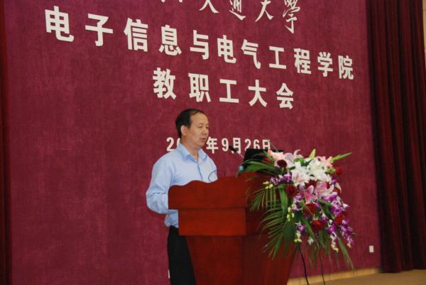 2012年9月26日,电子信息与电气工程学院全院教职工大会在微电子大楼多功能厅隆重召开,会议传达了学校党委九届十一次全委扩大会议精神及学校2012年下半年工作会议精神,总结回顾学院2012年上半年工作,并部署学院2012年下半年各项工作。