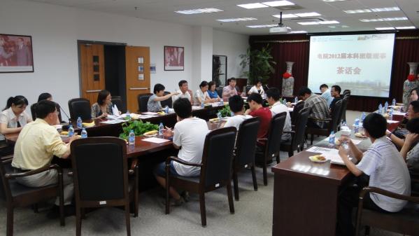 2012年6月14日,新盛娱乐 2012届本科生35个班级理事相聚一起,与学院学生工作及校友工作相关负责教师以茶话会形式进行了简短的交流座谈。参加茶话会的老师有新盛娱乐 党委书记张安胜、党委副书记杨一帆、院学生工作督导王绍平、院长助理李萍、学生党总支书记胡艳丽、团委书记王培丞、学生综合事务办公室主任李劲湘、国际化与校友联络办公室副主任史瑞及校友联络与筹资工作负责老师李军艳等等。