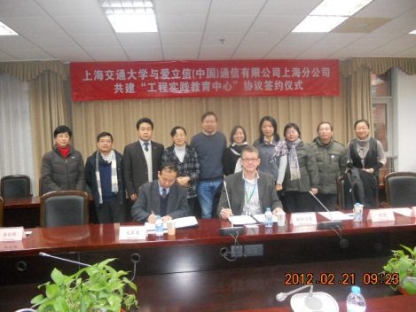 2012年2月21日,新盛娱乐 常务副院长毛军发代表上海交通大学与爱立信(中国)通信有限公司上海分公司签订了一份上海交通大学和爱立信(中国)通信有限公司共建“工程实践教育中心”的协议。教务处副处长郑益慧、分管本科教学副院长张焰、院长助理李萍、电气系系主任严正、电气系副系主任王君艳、电子系副系主任周玲玲等院系领导参加了会谈。