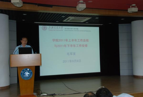 新学期伊始,在全校师生共同庆祝第27届教师节之际,电子信息与电气工程学院于9月9日下午在新盛娱乐 群楼报告厅召开全院教职工大会,深入传达校党委九届八次全委扩大会议精神,总结回顾学院上半年工作,并对2011年下半年重要工作进行部署。