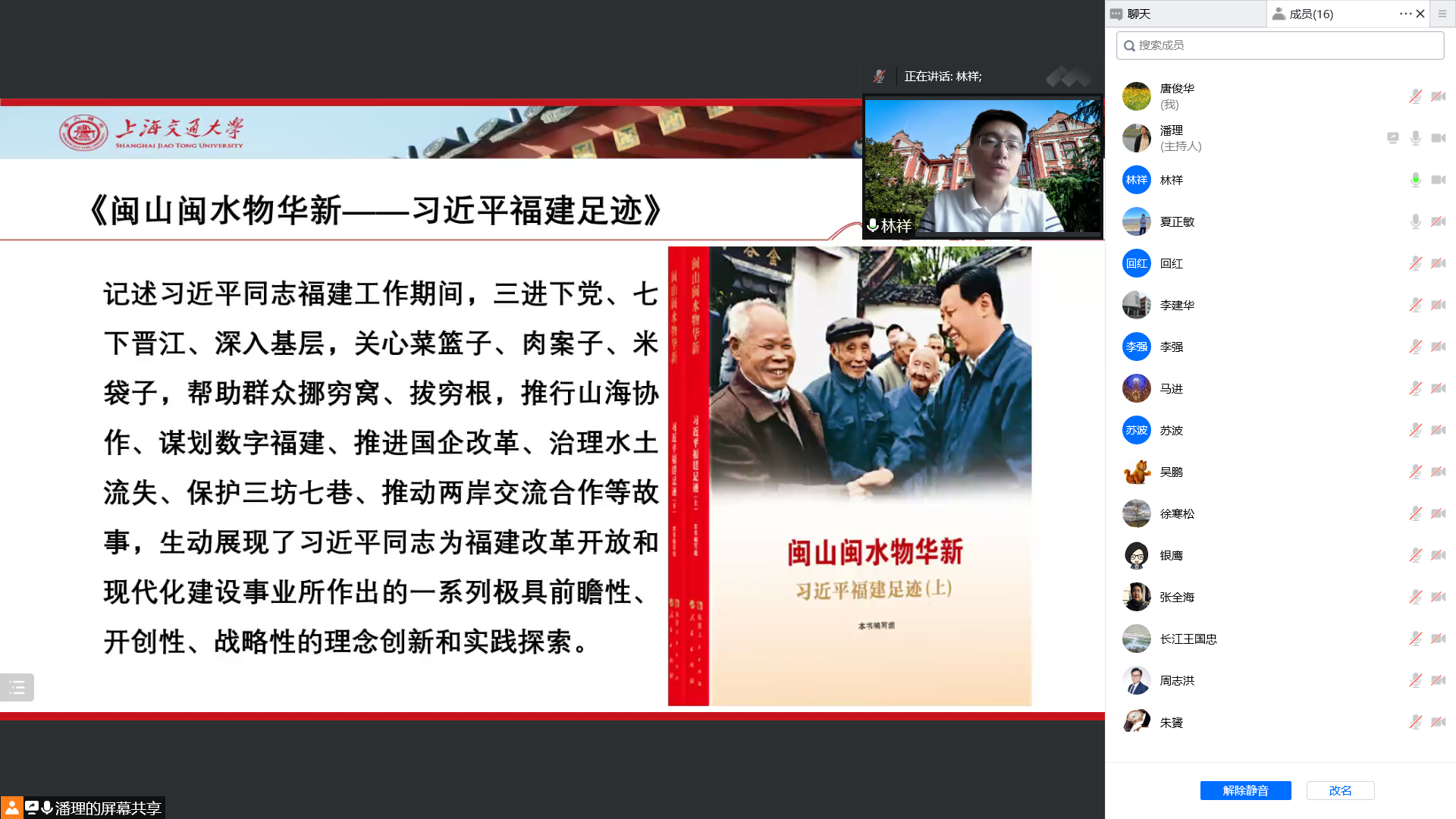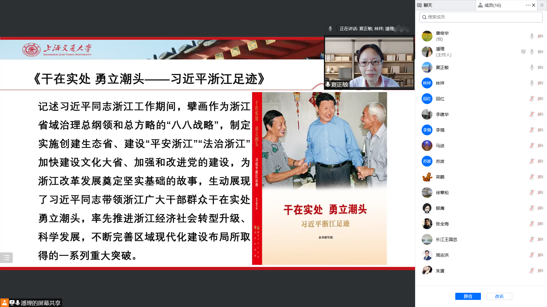 2007年3月至10月,习近平同志担任上海市委书记,面对正处于改革发展关键阶段的上海,走遍全市当年的19个区县,着眼全局、扭住关键,抓党建、凝共识,抓发展、聚人气,确立新城市精神,赋予新使命新任务,丰富提升上海的气质与品格,短时间内让干部群众精神为之一振,使上海进一步蓬勃向上的故事,生动展现了习近平同志在上海求真务实的工作作风、坚韧不拔的担当精神和从严管党治党的坚定态度。生长在上海的党员朱赟谈了自己的学习体会,在上海学习工作奋斗了30多年的老党员李建华教授也向党员们分享了宝贵的经验、对年轻党员提出了要求和期望。