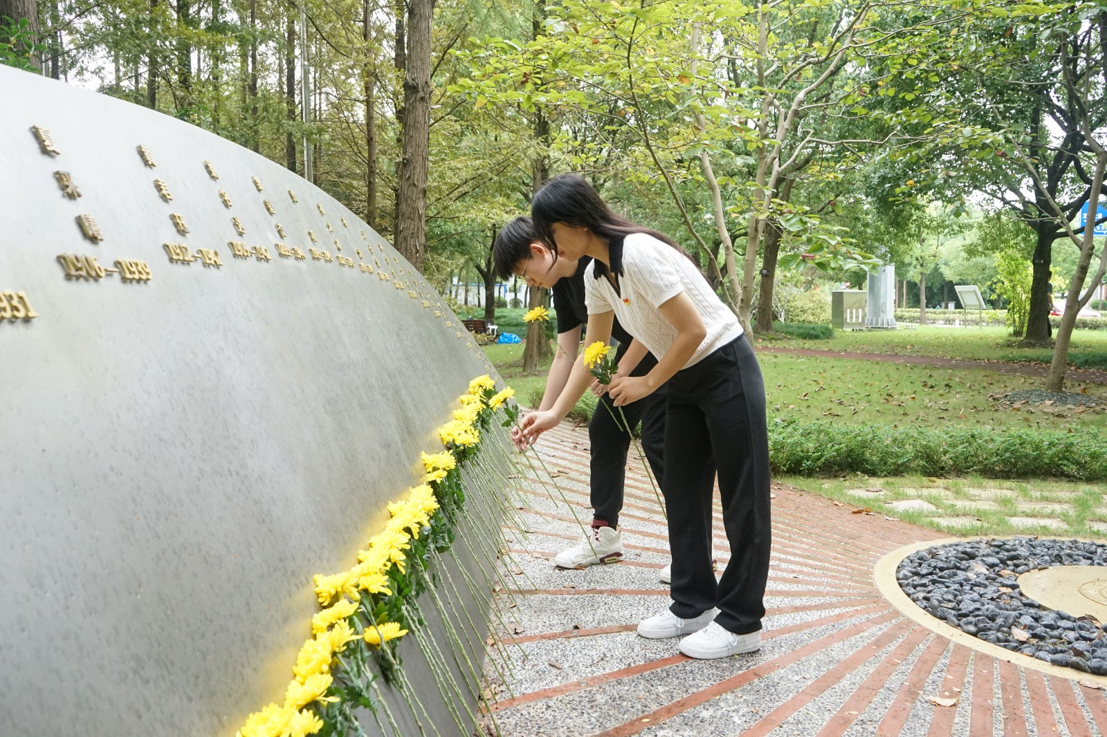 全体同学面向英烈纪念雕塑三鞠躬,并敬献鲜花,表达对交大革命英烈们的无限敬意和哀思。