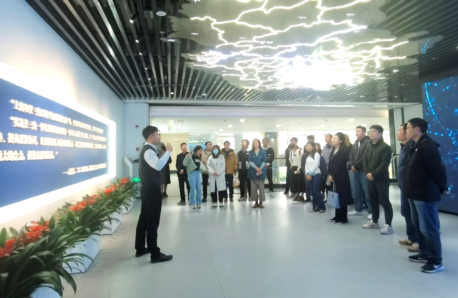 上海长三院第二党支部宣传委员、区域合作部高级业务经理任岚带领上海交大师生参观了长三角国创中心展厅,介绍了上海长三院的成立背景、主要运营方向及产业化成功案例。
