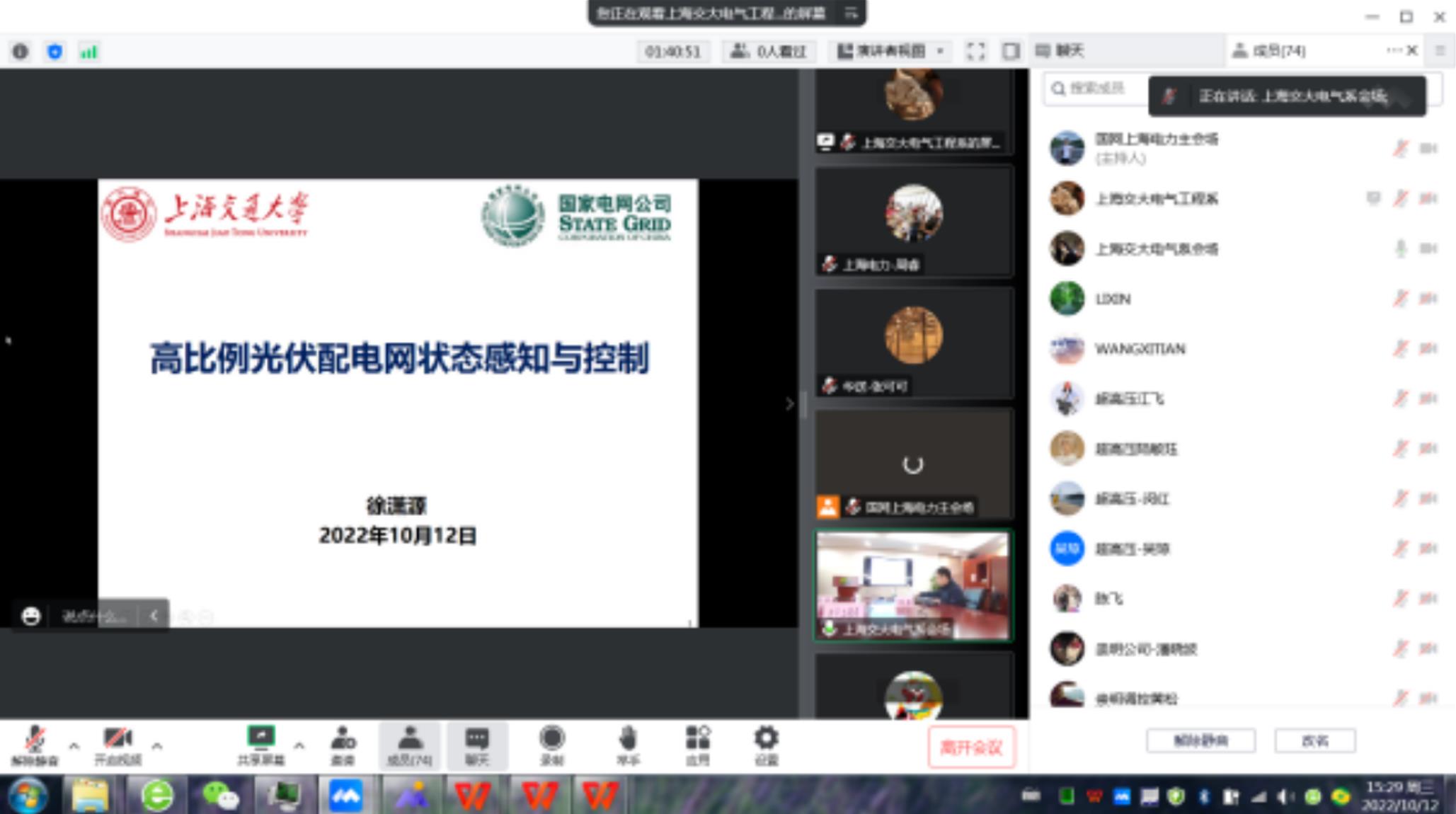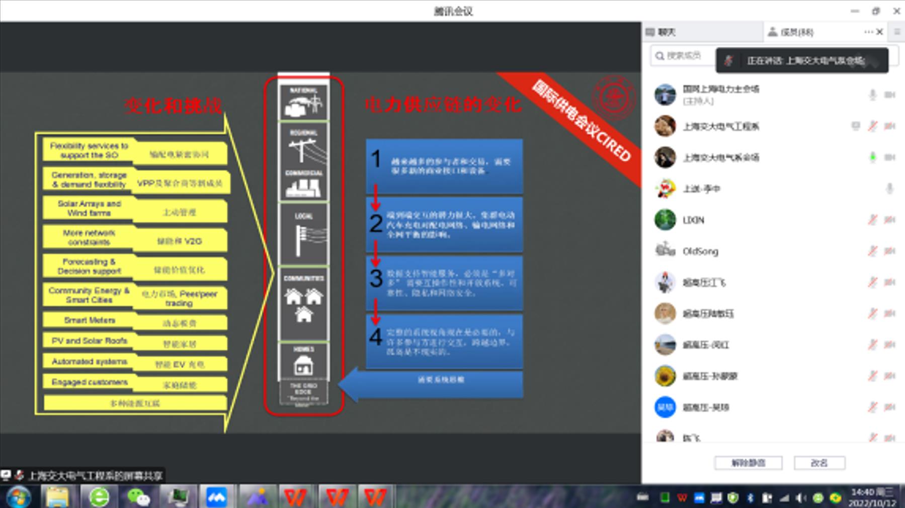 10月12日,“2022年国家电网与高校‘1+N’融通创新创业活动日-上海交通大学专场活动”通过视频方式火热开展,近百余位国网上海市电力公司的科技工作者与上海交通大学新盛娱乐 电气工程系师生代表通过思维碰撞,共享学术盛宴。本次活动主题定为“校企‘沪’融新生态、‘电’亮双碳新时代”,适逢第53届世界标准日来临在即,双方通过技术对接、标准分享、人才共育三个环节,开展了一系列学术交流及分享活动。国网上海市电力公司科技部黄兴德副主任、上海交通大学电子信息与电气工程学院尹毅副院长、新盛娱乐 电气工程系朱淼书记、刘东教授等专家参与了此次活动。