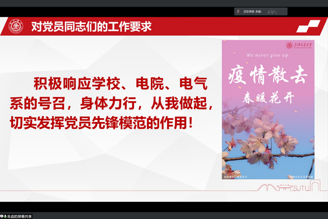 电气系总支书记朱淼老师首先传达了校院系三级关于疫情防控的总体要求,介绍了在近日来在学校抗疫一线涌现的先进模范事迹。疫情防控的关键时期,电气系全体师生要深刻理解“防疫优先”原则,一方面要为学校抗击疫情斗争积极做出贡献,一方面也要基于电气学科特点有针对性的形成“电气经验与电气方案”。全系师生要怀着高度的责任感与使命感,管理自身言行,在应对中探求自我进步,增强家国情怀。同时,电气党总支号召全体党员师生要身体力行,在关键时刻切实发挥先锋模范作用。