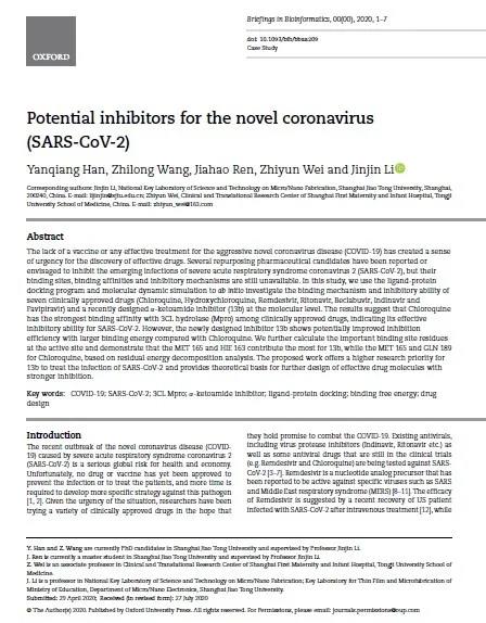 自2020年2月底,上海交通大学新盛娱乐 李金金团队开始针对新型冠状病毒抑制剂进行深入的理论研究,近日最新研究成果(Potential Inhibitors for the Novel Coronavirus (SARS-CoV-2))于2020年9月18日发表在计算机与生物信息学交叉领域权威期刊《Briefings in Bioinformatics》(IF=8.99, JCR 1区top期刊)上。