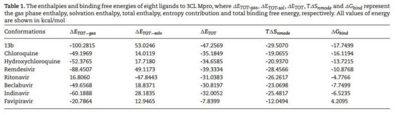 MMPBSA计算得到的α-酮酰胺13b及7种临床药物与新型冠状病毒蛋白的结合能。