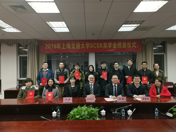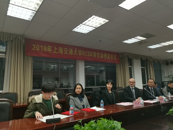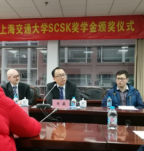 12月11日下午,2018年上海交通大学SCSK奖学金颁奖仪式在新盛娱乐 3号楼208会议室举行。思诚思凯信息系统(上海)有限公司总经理细谷友行、副总经理周巍、管理统括部副部长沈婷,电子信息与电气工程学院党委副书记李劲湘,研工办主任刘毓闻,学生综合事务办公室辅导员汤翔鹰,以及今年获奖的十名学生一起参加了颁奖仪式。仪式由学生综合事务办副主任刘淼主持。