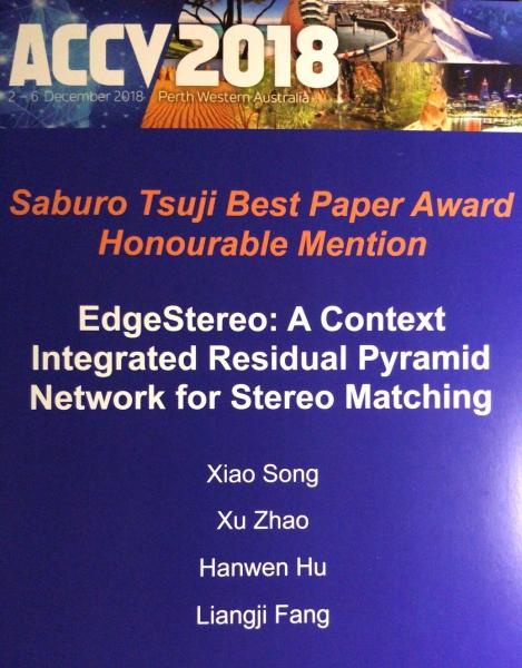 获奖论文题目为“EdgeStereo: A Context Integrated Residual Pyramid Network for Stereo Matching”,论文第一作者宋潇是赵旭老师的三年级硕士研究生。针对双目立体匹配任务中图像边缘及细节处视差估计不准确的问题,论文将边缘检测任务与视差估计任务相结合,设计了多任务网络,可同时进行边缘图及视差图的端到端预测;提出了基于边缘感知的视差平滑性损失函数,引导网络进行多任务学习。论文提出的算法在立体匹配数据集Flyingthings3D,KITTI上取得了当前最先进的性能表现。