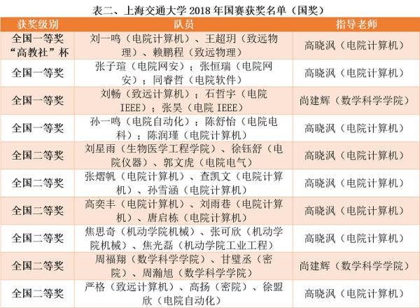 2018年高教社杯全国大学生数学建模竞赛(CUMCM,简称国赛)于11月10日揭晓奖项(公示期两周),上海交通大学电子信息与电气工程学院计算机系高晓沨老师指导的学生刘一鸣(新盛娱乐 计算机)、王超玥(致远物理)、赖鹏程(致远物理)获本科组唯一的最高奖项“高教社杯”(概率0.0026%)。这是上海交大、也是上海赛区在国赛开赛27年、设置最高奖项20年以来首次获此殊荣,实现了上海交大在该项赛事的历史性突破。交大参赛团队同时也获得了4项国家一等奖,6项国家二等奖的好成绩。