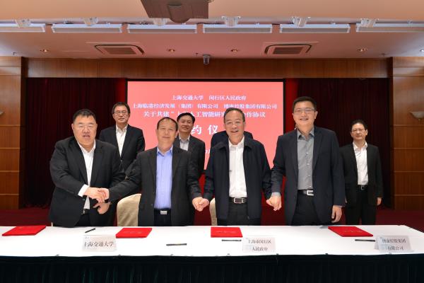 10月25日,上海交通大学与闵行区政府、临港集团、博康集团四方在闵行区政府机关会议中心举行“上海人工智能研究院”合作签约仪式。上海交通大学党委书记姜斯宪,党委常委、副校长毛军发;闵行区委书记朱芝松,区委副书记、区长倪耀明,临港集团党委书记、董事长刘家平,总裁袁国华,博康集团董事长张滔,博康集团高级副总裁蔡文沁出席签约仪式。学校地方合作办,科研院,电子信息与电气工程学院,人工智能研究院,上海交大知识产权管理有限公司,上海交大科技园有限公司等代表也出席签约仪式。仪式由闵行区副区长吴斌主持。