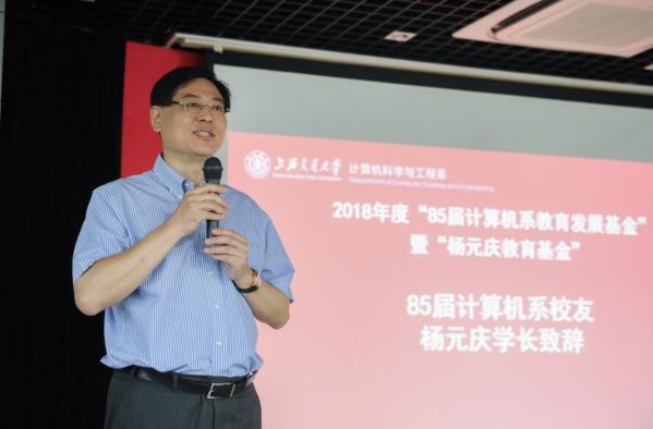 杨元庆学长代表计算机系85届校友致辞。他表示,很荣幸能够通过设立基金,为母校的人才发展和教学科研尽力。基金也成为连接老校友和母校的一个桥梁。杨元庆表示,交大是自己最魂牵梦萦的地方,因为这里是梦开始的地方。在交大的学习和熏陶,使得他走上了从事计算机产业的道路。他提到,人类社会经历3次重大变革,以计算机、高速网络为代表的信息化革命给中国和世界带来了翻天覆地的变化,几乎每个人都用上了计算机、手机。现在时代发展越来越快,数字化浪潮还没结束,智能化时代已经走来。中国在人口和数据方面天然地拥有大数据优势,同时在高性能计算方面具有世界领先水平,但在如算法、芯片等领域与美国相比还比较落后。我们要清醒认识到自身的不足,持之以恒地进行技术和科学研究,不要急功近利。当前时代,人才尤为重要,基金会继续为交大的人才发展助力。饮水思源、爱国荣幸的交大精神流淌在每个校友的血液里。