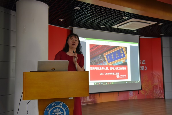 高怡祯进行监考培训,强调监考老师一定要提前15分钟到达考场,在正式开考之前完成“考场规则宣布”、“座位安排”、“考场清理”、“试卷发放”等工作,开考后仔细核查考生证件,考试过程中认真监考,不做与监考无关的事情。她提到,监考并不是一项难度很高的工作,只要监考老师有高度的责任心,监考工作就一定会顺利地完成。