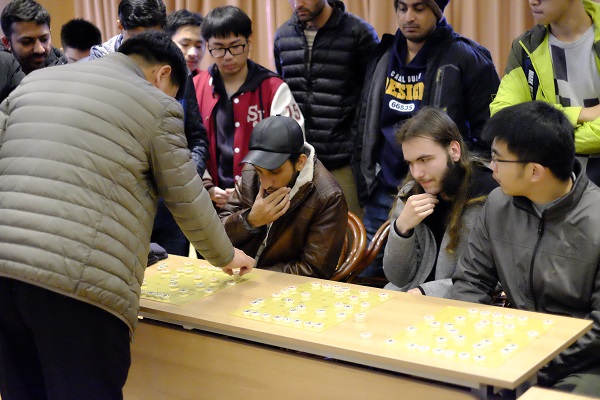 接着,葛老师同一时间与十名学生轮流下棋。留学生们纷纷上前,期待与大师级人物下一盘局。在一番激战后,葛老师对各位留学生们的表现表示赞赏,并说他们只要肯勤下棋,必定有机会成为一名实力棋手。