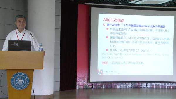 随后,一个由 15个讲演报告构成、以人工智能为主题的学术盛宴正式开启。潘云鹤院士首先做了题为“中国人工智能2.0”的主旨演讲。回顾人工智能60年的发展历史后,潘院士指出,人工智能走向2.0就是要“基于重大变化的信息新环境,发展新目标的新一代的人工智能”, “值此新一代的AI恰需整体布局、及时推进之际,中国应当有所作为!”,并为听众深入剖析了中国人工智能2.0的重点方向。