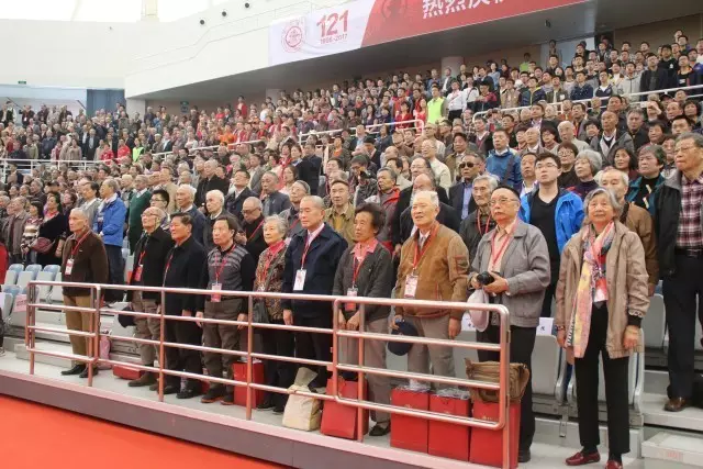 早晨九点多,霍英东体育馆里已经坐了不少校友。他们或者互相交谈叙旧,或者拿起相机记录母校点滴。