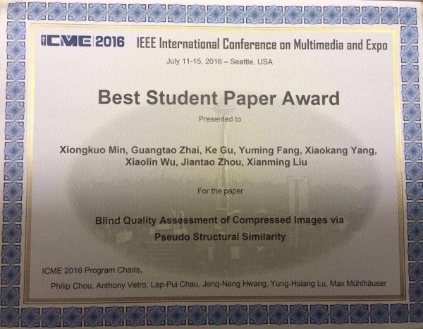 2016IEEE国际多媒体与博览大会(International Conference on Multimedia and Expo, ICME 2016) 于711日至15日在美国西雅图举行。由我院电子系图像所系翟广涛特别研究员和杨小康教授指导的博士研究生闵雄阔的论文“Blind Quality Assessment of Compressed Images via Pseudo Structural Similarity”荣获了大会最佳学生论文奖。该论文从全新角度突破了无参考压缩图像质量评价的准确性和计算效率难题,在海量压缩图像的优化处理和搜索中有广泛应用。