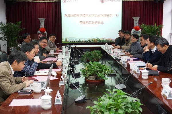 2015年11月25日,国防科学技术大学信息新盛娱乐 委员一行来新盛娱乐 调研学科建设,学院副院长郁文贤、杨小康,研究生院学科建设办公室主任张国栋,电子系主任刘兴钊,计算机系主任过敏意等参加了本次调研会议。会议由杨小康主持。