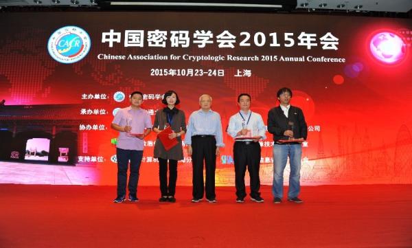 随后谷大武教授代表程序委员会和组织委员会,介绍了会议的论文征集、评审、接收、特邀报告、年会议程和年会组织筹备等情况。开幕式上还举行了2015年“中国密码学会奖” 颁奖仪式。仪式由于艳萍秘书长主持,她介绍了奖项推荐、评选情况,并宣读了奖励决定。本次年会分别颁发了“中国密码学会杰出贡献奖”、“中国密码学会优秀青年奖”、“中国密码学会先进集体奖”、“中国密码学会先进工作者”及“中国密码学会优秀会员奖”,我校特别研究员郁昱荣获“中国密码学会优秀青年奖”。蔡吉人院士、裴定一理事长、冯登国和徐茂智副理事长分别向相关获奖者颁发了奖杯和证书。开幕式结束后,大会全体代表合影留念。