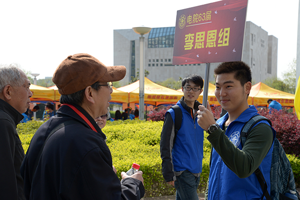 校庆大会结束,校友们在志愿者的引导下有秩序登车并前往餐饮大楼用餐。下午,志愿者们引导校友们参加院系的座谈会、联谊会,出席奖学金颁奖仪式,或参观校园、实验室。“学弟学妹们也都在做志愿者了”,一位在校期间曾经积极参加志愿服务活动的校友难掩欣喜地说道。