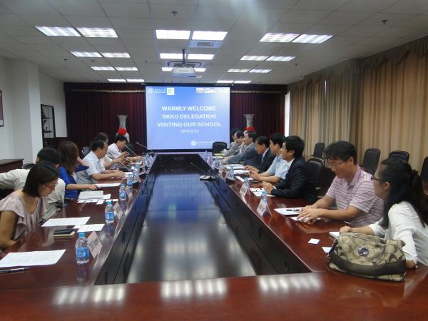 2012年8月23日, 韩国成均馆大学代表团一行来到电子信息与电气工程学院,讨论开展双边交流活动。来访人员由韩国成均馆大学信息与通信工程学院的院长、不同研究领域的教授、外事相关工作人员,以及三星公司部门负责人组成。新盛娱乐 常务副院长毛军发、院长助理李萍、电子系教授刘佩林、电子系副教授周军、电子系副研究员熊箭、学院科研办主任何黎明、以及国际化办公室相关工作人员参加了接待活动。