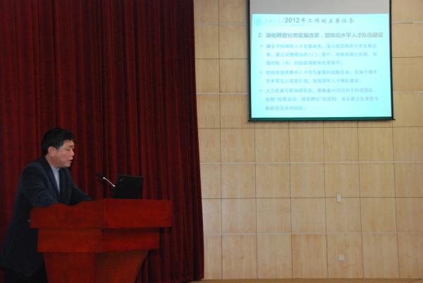 会上学院党委书记张安胜同志首先解读了学校九届九次全委扩大会议与2012年学校上半年工作会议精神,传达了马书记和张校长的重要讲话,回顾了 2011年学校工作,并结合“十二五”时期学校面临的新形势与新机遇,重点从深入落实中长期教育规划纲要,全面提高人才培养质量,深化师资分类发展改革,加快高水平人才队伍建设等六个方面介绍了学校2012年的主要工作任务。