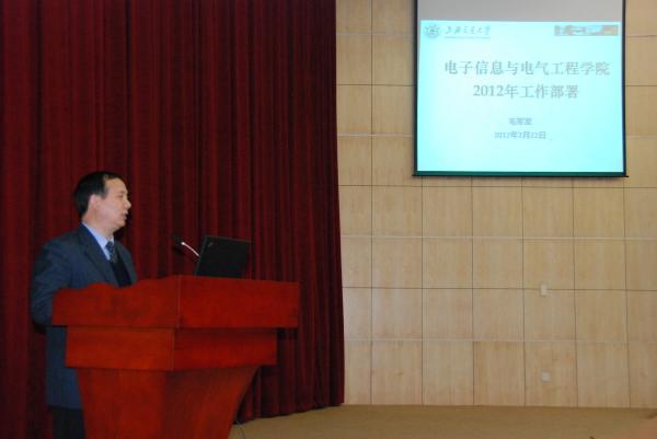 2012年2月22日,电子信息与电气工程学院全院教职工大会在微电子大楼多功能厅隆重召开,会议传达了学校九届九次全委扩大会议与2012年学校上半年工作会议精神,简要回顾了学院2011年工作,部署了学院2012年各项工作。