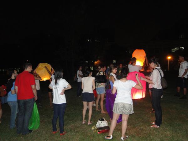 17点30分左后,在概沙的活动基本结束,中外学生在校园里共进晚餐。而后在电信群楼大草坪,共放孔明灯。看着寄托着祝福的孔明灯离手而去越飞越高,在夜空中缩为一个很小的光点,来自不同国家,拥有不同文化背景的中西方年青人的心已经靠得更近了。