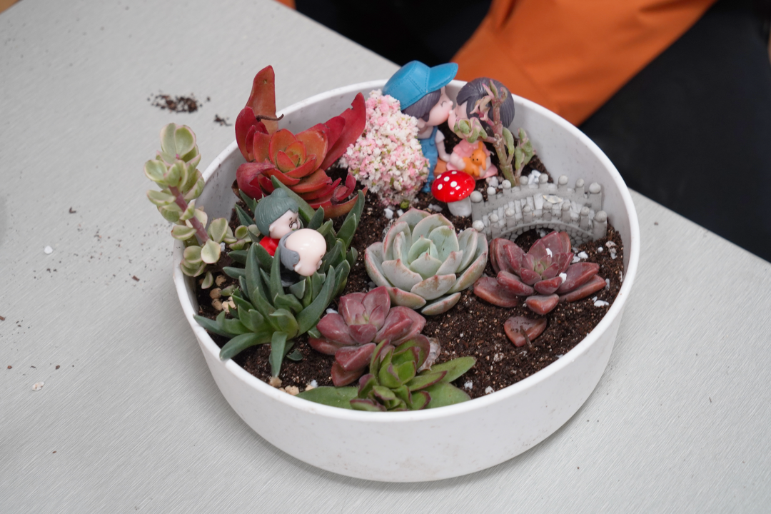 紧接着,同学们在老师的示范和指导下,进行着挖坑、放苗、填土、浇水、修剪等一系列种植过程。在专注种植的过程中,一幅幅微缩景观,一个个妙趣横生的小世界,逐渐呈现了出来。绿意,就这样在菁菁校园中流淌;而同学们也在绿植制作的过程中体验着耕耘于收获的意义,看着这些亲手种下的多肉盆栽,他们不禁感叹:“种植不易,护绿更难。”