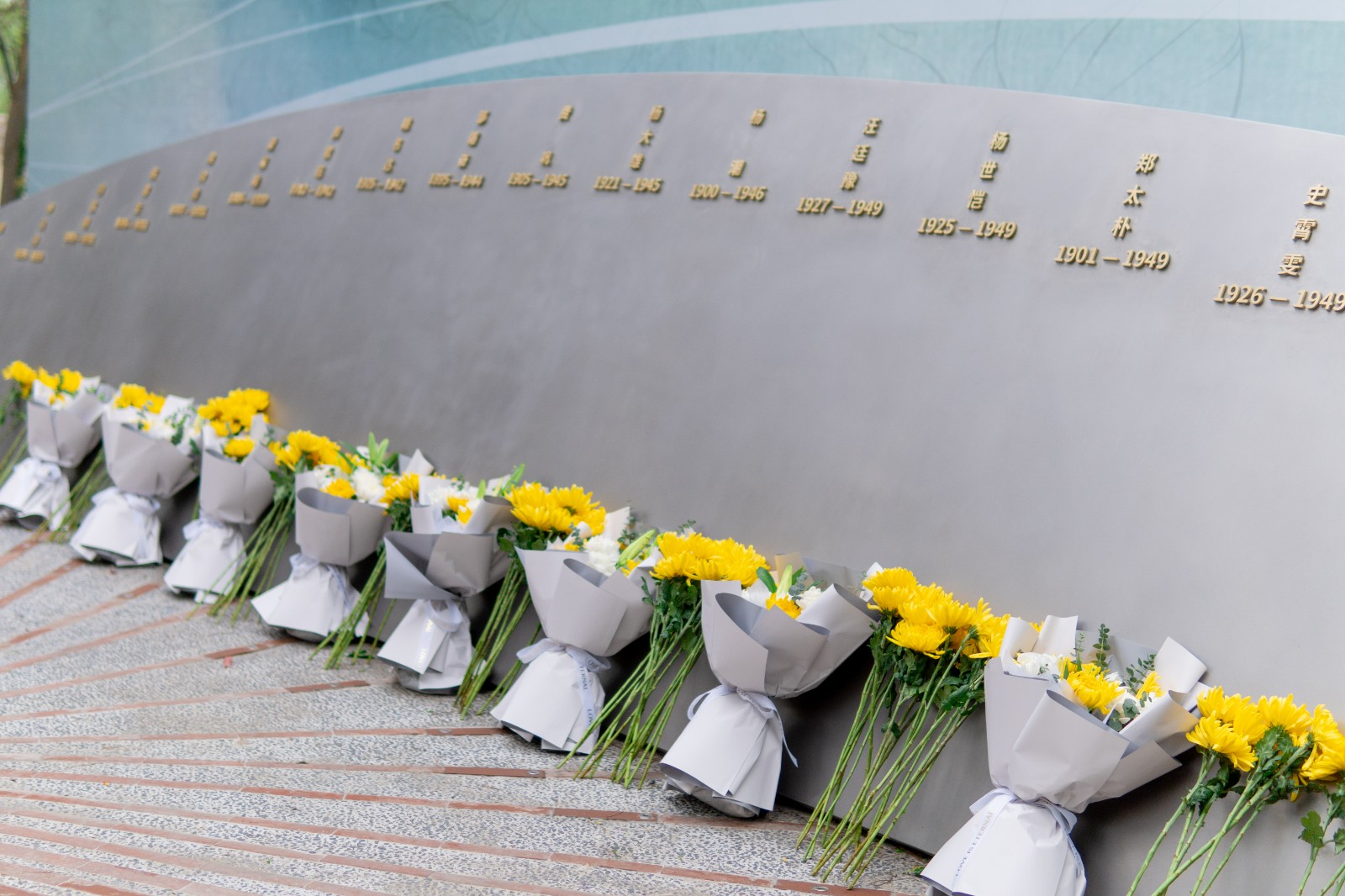 杨振斌和顾锋为英烈纪念雕塑揭幕。纪念碑呈扇形,记录了28名英烈的姓名和生卒年,展现了他们为国捐躯的光辉事迹,见证着他们为党作出的重大贡献。雕塑以上海交通大学校徽为圆心,由红砖向外辐射了28条射线,引向先烈们的姓名。夜晚,当淡水河畔的灯光亮起,纪念雕塑也会被点亮,亦如先烈们投身革命事业的身影一般熠熠闪烁。