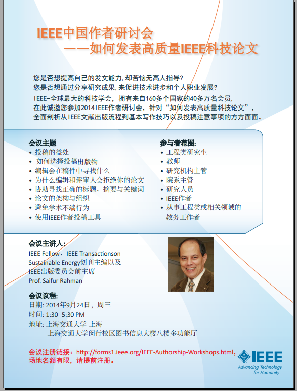 IEEE诚邀您参加在当地高校举办的作者研讨会“如何发表高质量IEEE科技论文”。本次研讨会将关注IEEE投稿的方方面面,从IEEE文献出版流程到基本的写作技巧和投稿相关内容。